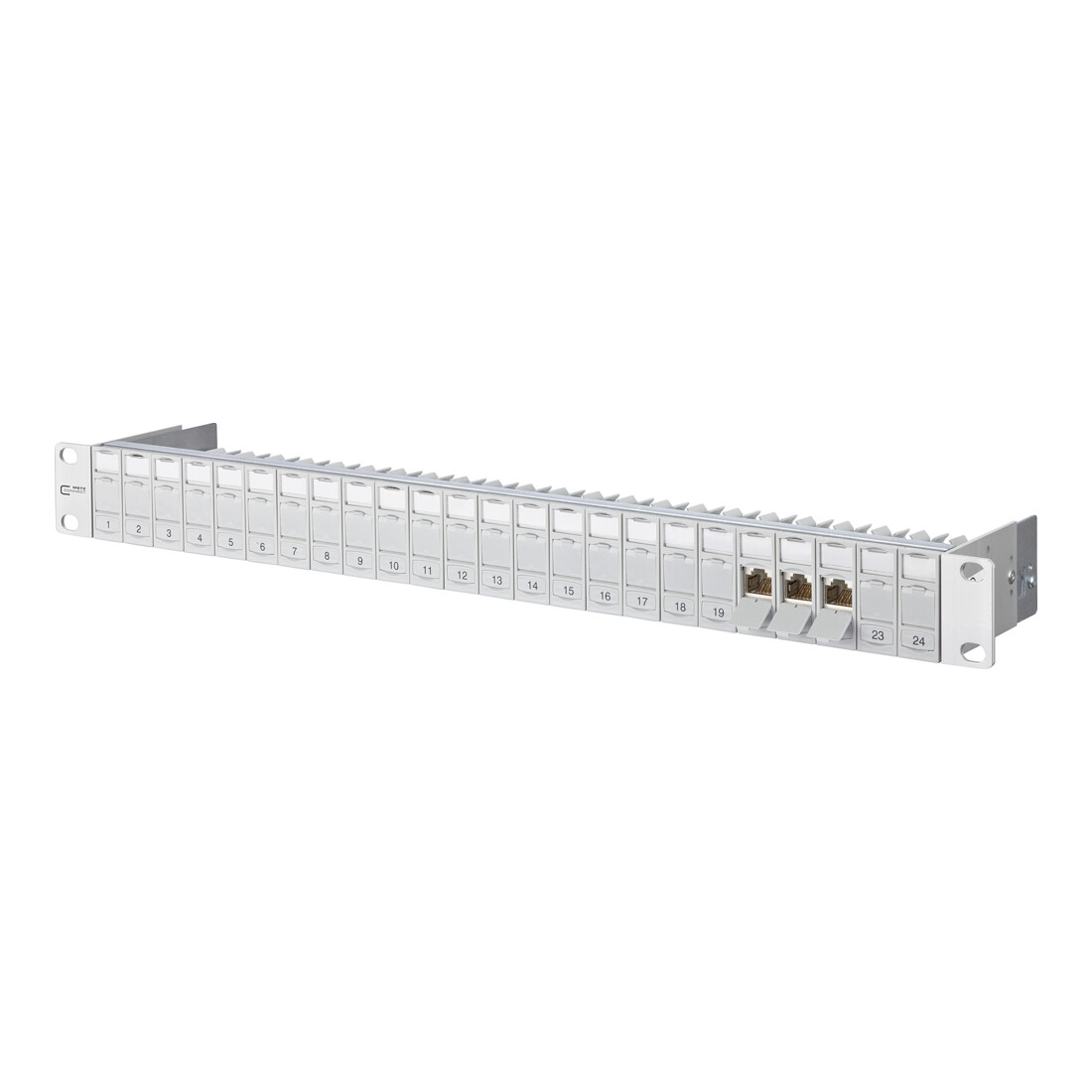 • 19 Zoll 1HE Modulträger mit 24 E-DAT modul Einzelmodulen, Cat.6, A Komponentenprüfung nach ISO/IEC 11801 Ed.2.2:2011-06, DIN EN 50173-1:2011-09, TIA/EIA-568-C.2 (2009-08) und IEC 60603-7-51 Ed.1 (12/2008)Einhaltung der Klasse E, A nach ISO/IEC 11801 Ed.2.2:2011-06, DIN EN 50173-1:2011-09getestet: Link bis 500 MHz, für 10 GBit Ethernet (IEEE 802.3an), Remote Powering (PoE, PoE plus, UPoE und 4PPoE) und HDBaseT geeignet, montagefreundlicher Anschluss der 2- bis 4-paarigen Datenleitung AWG 26/1 - 22/1 und Litzenleiter mit 7-drähtiger Cu-Litze AWG 26/7 - 22/7 an BTR 8fach IDC-Schneidklemmen, Kennzeichnung der Adernbelegung T568A oder T568B, Modulträgerfront aus silber eloxiertem Aluminium, Modulhalter aus Kunststoff mit Staubschutzklappen (weitere Farben als Zubehör erhältlich) nach vorne entnehmbar, integrierte Kabelabfangung, zusätzliche Zugentlastung möglich, Sichtfenster für Beschriftungseinlage, Beschriftungsbogen 210 x 297 mm siehe Zubehör, Erdungsbolzen M6 x 10 mit Mutter und Zahnscheibe, inkl. 30 cm Erdungskabel, alle vollgeschirmten Module mittels Erdungsschiene verbunden