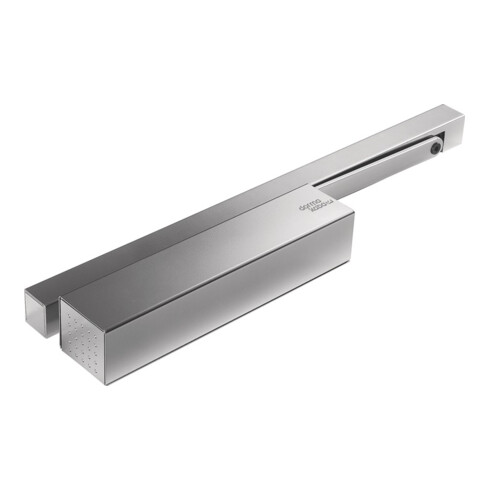 bestehend aus: Türschließer TS 93 G Gleitschienen-Türschließer nach EN 1154 · Schließkraft Größe EN 2-5 · im Contur Design · mit stark abfallendem Öffnungsmoment für leichtes Türöffnen gem. DIN SPEC 1104 · Schließgeschwindigkeit und Endschlag über Ventil komfortabel von vorn stufenlos einstellbar · hydraulisch kontrollierte Öffnungsdämpfung und Schließverzögerung einstellbar · Montagekonsole mit universellem Lochgruppensystem · DIN links und rechts verwendbar · für Türblattmontage Bandgegenseite (Öffnungswinkel auf ca. 120° - 145° begrenzt) · bei Feuer- und Rauchschutztüren muss ein Türstopper gesetzt werden oder Sturzmontage Bandseite (Öffnungswinkel bis 180° möglich) Gleitschiene G-EMF Contur Design mit Hebel · für TS 93 B oder G · ermöglicht ein exaktes Feststellen der Tür ohne Rückfederung · der Feststellpunkt ist auf einen Öffnungswinkel zwischen ca. 80° und 140° einstellbar · Hinweis: Feststellpunkt ist gleichzeitig max. Türöffnungswinkel, Türstopper setzen · im Alarmfall oder bei Stromausfall wird die Feststellung aufgehoben und die Tür vom Türschließer geschlossen · die Ansteuerung erfolgt über externe Rauchmeldezentralen (z. B. DORMA RMZ) · inkl. Hebel, Gleitschiene, elektromechanische Feststelleinheit, Verkleidung, Befestigungsschrauben und Endkappen · die Gleitschiene wird am Sturz montiert und ist sowohl für DIN-L als auch für DIN-R-Türen verwendbar Weitere technische Eigenschaften: · Ausführung: Komplettset