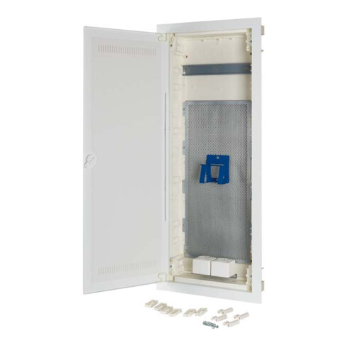 - Hohlwand-Multimediaverteiler KLV, Kunststoff-Verteiler mit Stahlblechtür mit Ventilationsöffnungen, Markierungsschlitze im Mauerkasten, flaches Türrahmendesign, stabiler Türdrehriegel optional austauschbar durch Sicherheitsschließung, Kabelhalter für aufgeräumte Leitungsführung, umfangreiches Zubehörsortiment, Lieferumfang: Gehäuse, 1x Tragschiene, Montageplatte mikroperforiert, 1x Gerätehalter, 2x einfach Steckdosen Euro2-Adapter, Libelle, 3D-Putzausgleich mit bis zu 18mm Tiefenausgleich, Kabelhalter, Hohlwandanker, Montageanleitung, praxisgerechte Spezialverpackung