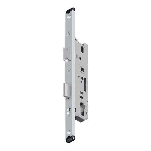 Schlosskasten aus Stahl oben und unten geschlossen · durchgehende Beschlagbohrung oberhalb der Schlossnuss · Späneschutzhülsen · 1-tourig mit stabilem Riegel · DIN links und rechts verwendbar · Anschlagrichtung umstellbar · vorgerichtet für Profilzylinder, mit Wechsel · Entfernung 92 mm · 8 mm Klemmnuss · Falle und Riegel vernickelt · Stulp auf Mitte · käntig · Klassifizierungsschlüssel nach EN 12 209 vorhanden ·