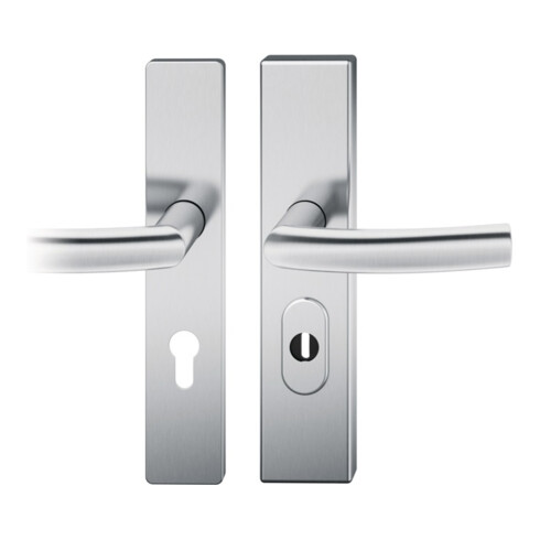 Langschild-Garnitur · für Außentüren · geprüft nach DIN 18257 und 18273 · außen gekröpfter rechteckiger Flachknopf · innen Türgriff fest/drehbar gelagert · Drückerausführung FSB 1107 · verdeckte, durchgehende Befestigung · Lochung PZ, mit Zylinderabdeckung · Entfernung 72 mm · Vierkant 9 mm · Türstärke 53-57 mm · DIN links / rechts verwendbar Weitere technische Eigenschaften: · Ergänzung: D/D · Widerstandsklasse: ES 1 · Zylinderabdeckung: mit ZA · Norm: DIN 18273 · Lagerung: fest-drehbar-gelagert · Vierkant: 9mm