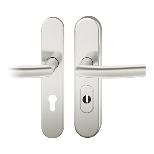 Langschild-Garnitur · für Außentüren · geprüft nach DIN 18257 und 18273 · außen gekröpfter runder Flachknopf · innen Türgriff fest/drehbar gelagert · Drückerausführung FSB 1107 · verdeckte, durchgehende Befestigung · Lochung PZ, mit Zylinderabdeckung · Entfernung 72 mm · Vierkant 9 mm · Türstärke 53-57 mm · DIN links / rechts verwendbar Weitere technische Eigenschaften: · Ergänzung: D/D · Widerstandsklasse: ES 1 · Zylinderabdeckung: mit ZA · Norm: DIN 18273 · Lagerung: fest-drehbar-gelagert · Vierkant: 9mm