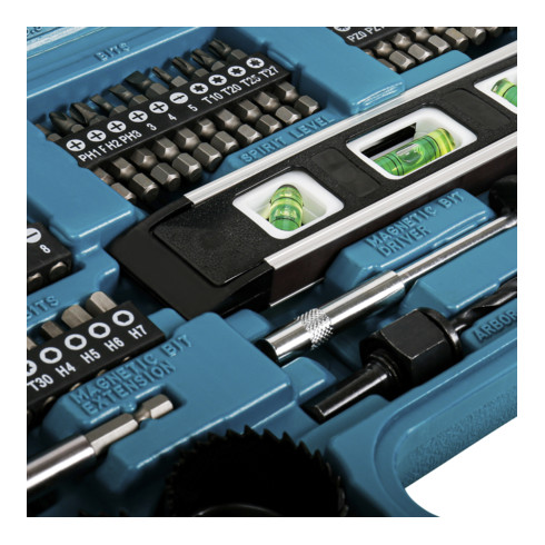 - Im Koffer sind Bohrer, Lochsägen, eine Wasserwage, Bits und Schraubendreher enthalten