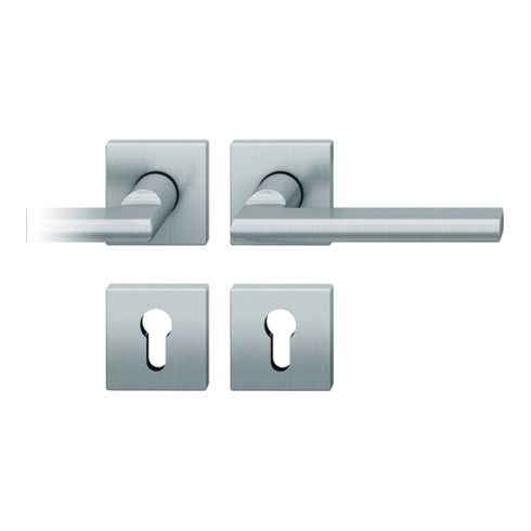 ASL®-Standardlagerung von FSB · Drücker-Modell 1035, ursprünglich aus dem Modell 1076 als Anschauungsmuster gefräst hat das Modell seinen festen Platz im Sortiment, hier interpretiert mit eckiger Rosette · vorgerichtet für Türstärken von 39 - 58 mm · Vierkant 8mm · Quadratrosette mit Stütznocken und Hochhaltefeder · DIN links/rechts verwendbar · inkl. Befestigungsmaterial für durchgehende Verschraubung · Wechselgarnitur mit Knopf 23 0811 · Weitere technische Eigenschaften Drückerlänge: 137mm · Befestigungssystem: ASL®-Technik · Ergänzung: D/D · Drückertiefe: 57mm · Nockenabstand: 38mm · Farb-Nr.: F69 · Norm: DIN 1906 Lieferung als Komplett-Garnituren in Einzelverpackung